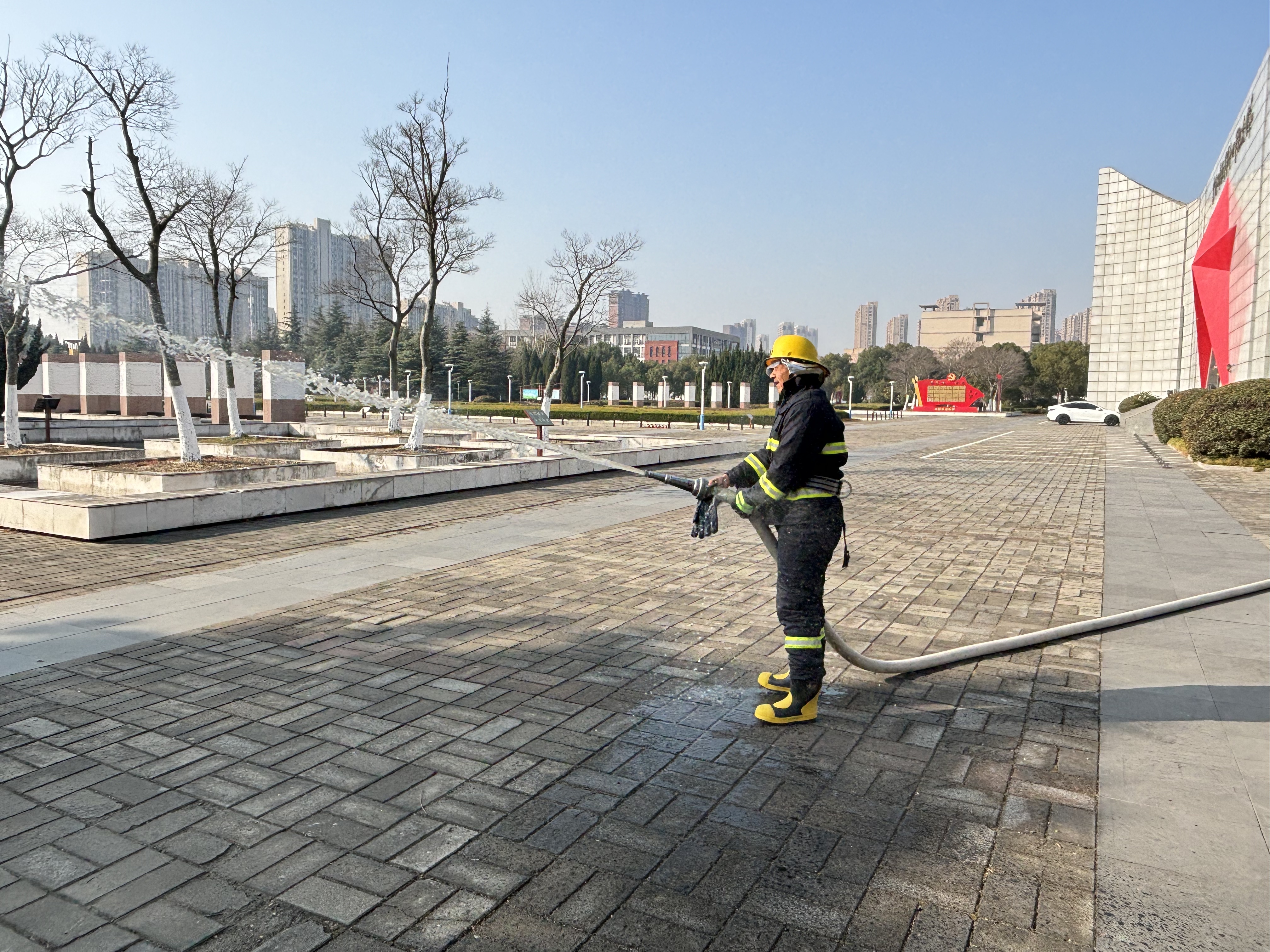 年终安全工作会议结束后,全体工作人员根据消防应急演练疏散方案要求,进行演练场景及灾情假设:假设在参观开放期间,发生火灾,大火迅速蔓延,浓烟滚滚,严重威胁人员生命,纪念馆各相关部门组织人员对火灾进行初始处置,同时组织全体人员进行紧急疏散,疏散完成后集中进行点评、总结并做消防技能培训。最后,组织现场教学培训,熟悉灭火设备的使用。