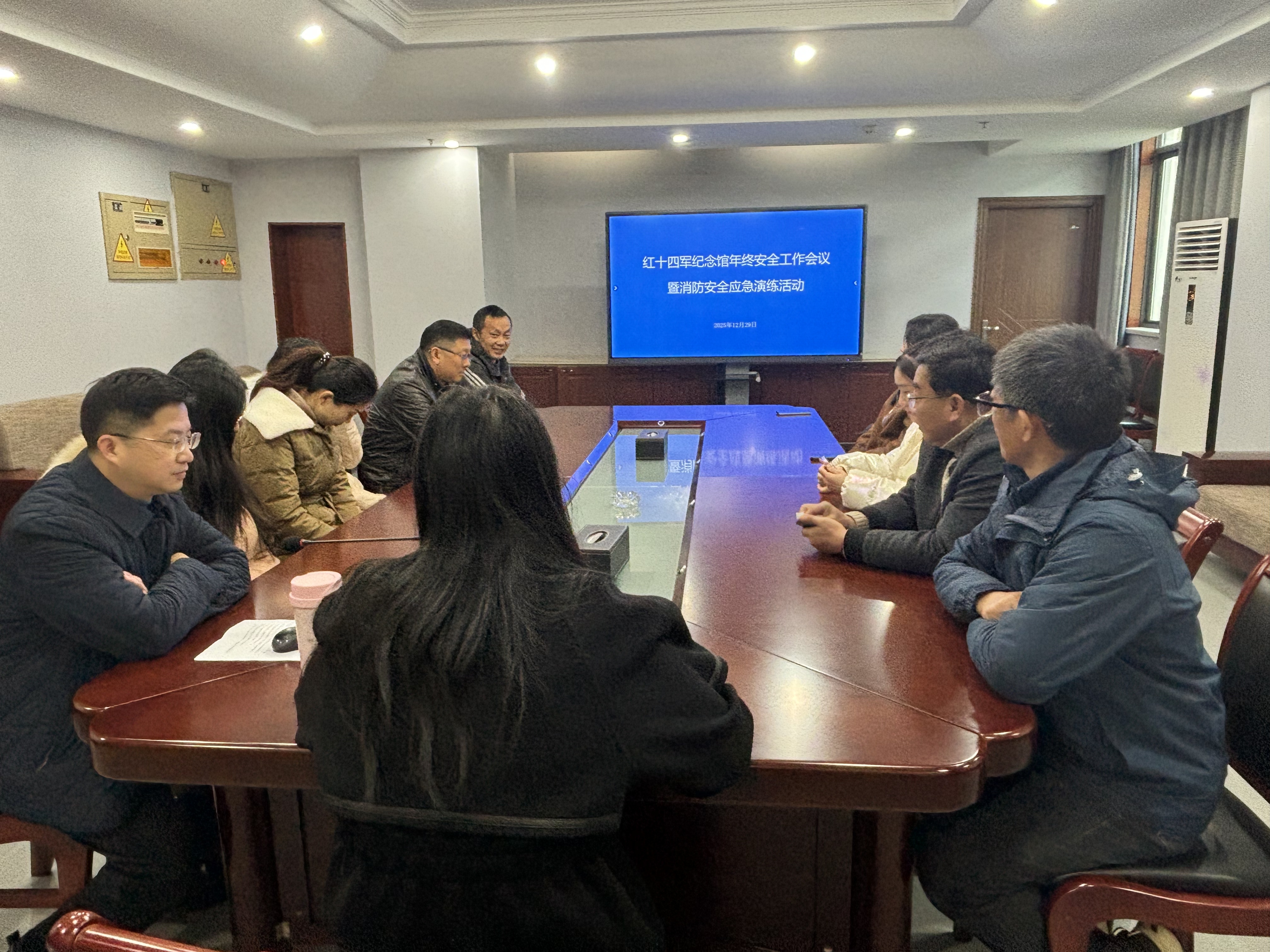 年终安全工作会议在纪念馆一楼会议室召开,全体工作人员参加了此次会议。会议首先对《习近平总书记关于安全生产的重要论述(2025)》进行学习,随后开展安全教育工作宣讲,主要学习了《红色资源讲解员服务规范》中的安全要求,最后由纪念馆副馆长叶雯对过去一年的安全工作进行了总结回结,并提出纪念馆在安全工作上的要求。